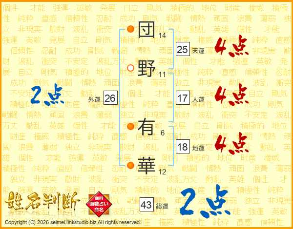 生活面を象徴する運勢です。外部から受ける影響力を表し、結婚運、家庭運や職場、環境への順応性を表します。総運から人運を引いた画数。姓や名が1文字の場合を除く。