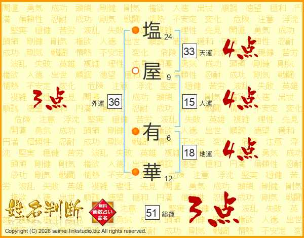 塩(24画)屋(9画) 有(6画)華(12画)