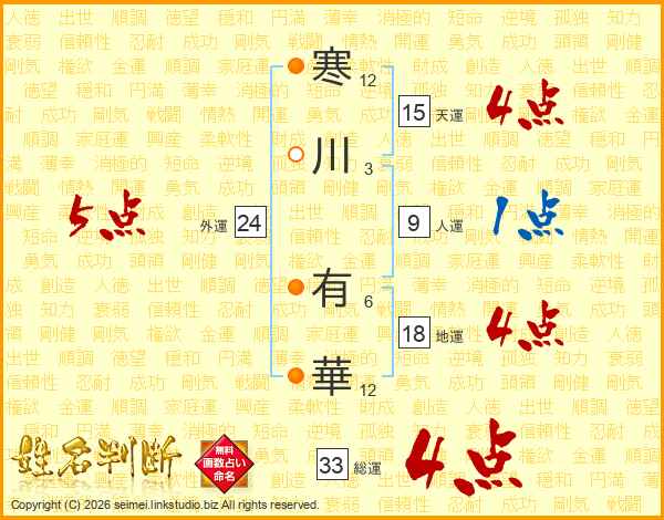 生活面を象徴する運勢です。外部から受ける影響力を表し、結婚運、家庭運や職場、環境への順応性を表します。総運から人運を引いた画数。姓や名が1文字の場合を除く。