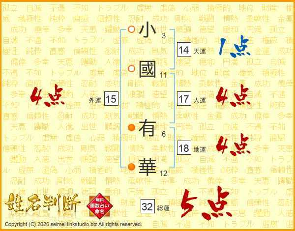 生活面を象徴する運勢です。外部から受ける影響力を表し、結婚運、家庭運や職場、環境への順応性を表します。総運から人運を引いた画数。姓や名が1文字の場合を除く。
