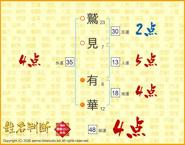 鷲見有華さんの総運は48画の4点!