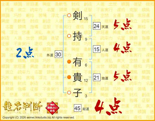 剣(15画)持(9画) 有(6画)貴(12画)子(3画)
