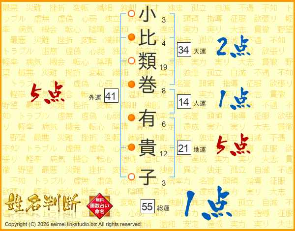 小(3画)比(4画)類(19画)巻(8画) 有(6画)貴(12画)子(3画)