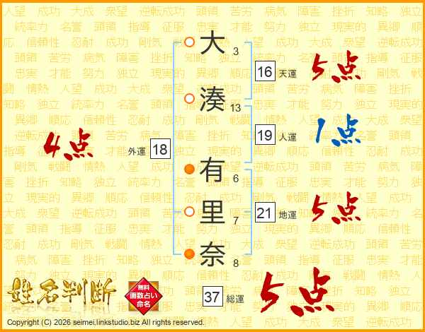大(3画)湊(13画) 有(6画)里(7画)奈(8画)