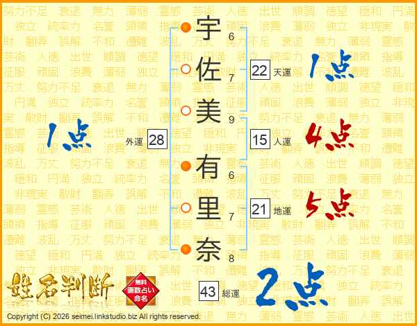 宇(6画)佐(7画)美(9画) 有(6画)里(7画)奈(8画)