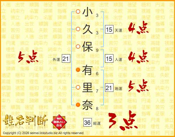 小(3画)久(3画)保(9画) 有(6画)里(7画)奈(8画)