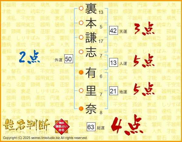裏(13画)本(5画)謙(17画)志(7画) 有(6画)里(7画)奈(8画)