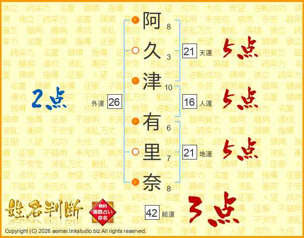 阿(8画)久(3画)津(10画) 有(6画)里(7画)奈(8画)