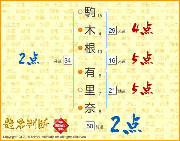 駒(15画)木(4画)根(10画) 有(6画)里(7画)奈(8画)