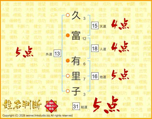 久(3画)富(12画) 有(6画)里(7画)子(3画)