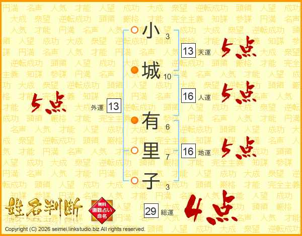 小(3画)城(10画) 有(6画)里(7画)子(3画)
