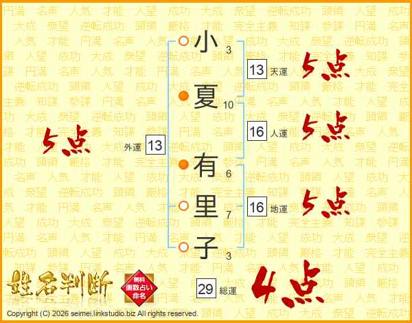 小夏有里子さんの総運は29画の4点!
