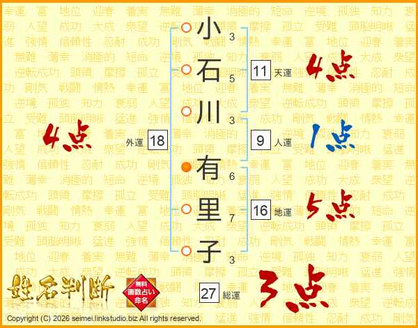 小(3画)石(5画)川(3画) 有(6画)里(7画)子(3画)