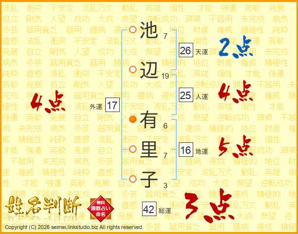 池(7画)辺(19画) 有(6画)里(7画)子(3画)