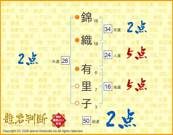 錦(16画)織(18画) 有(6画)里(7画)子(3画)