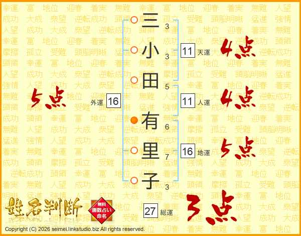 三(3画)小(3画)田(5画) 有(6画)里(7画)子(3画)