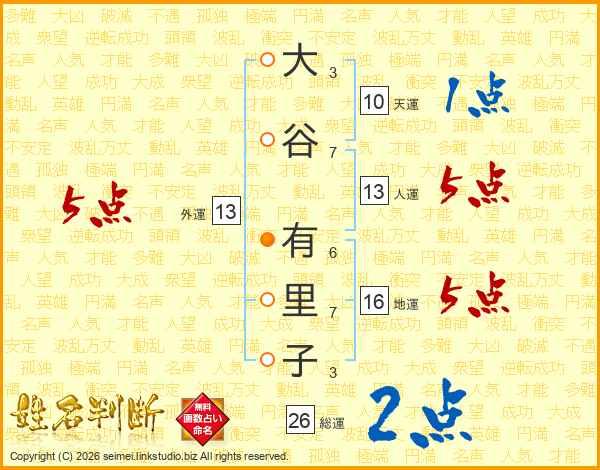 大谷有里子さんの人運は13画の5点!