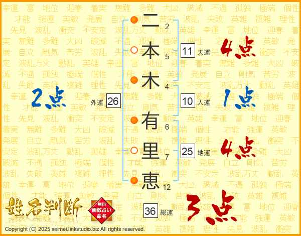 二(2画)本(5画)木(4画) 有(6画)里(7画)恵(12画)