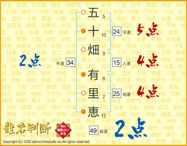 五(5画)十(10画)畑(9画) 有(6画)里(7画)恵(12画)