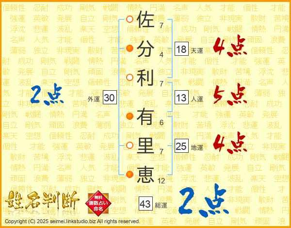 佐(7画)分(4画)利(7画) 有(6画)里(7画)恵(12画)