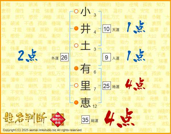 小(3画)井(4画)土(3画) 有(6画)里(7画)恵(12画)