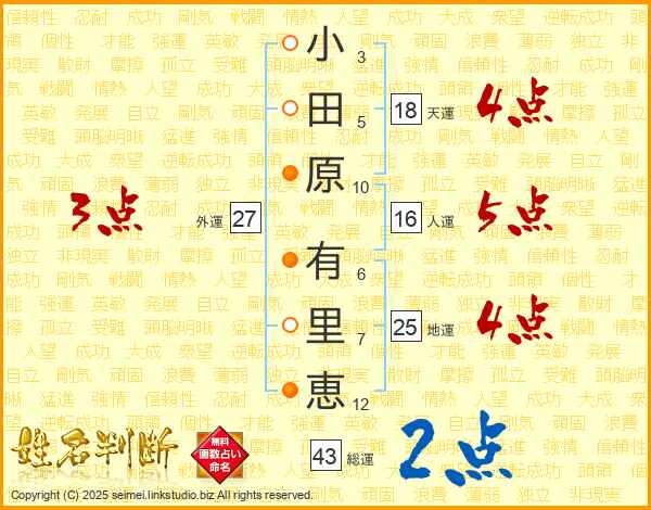 小(3画)田(5画)原(10画) 有(6画)里(7画)恵(12画)
