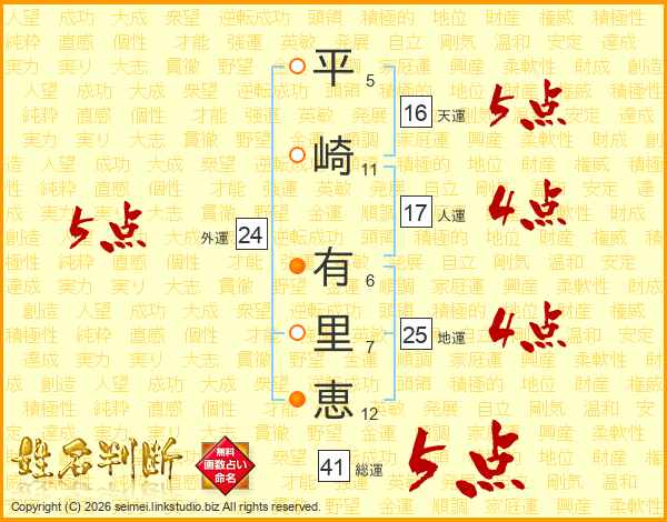 平崎有里恵さんの総運は41画の5点!