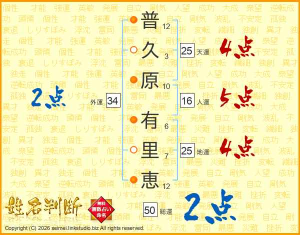 普(12画)久(3画)原(10画) 有(6画)里(7画)恵(12画)