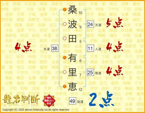 桑(10画)波(9画)田(5画) 有(6画)里(7画)恵(12画)