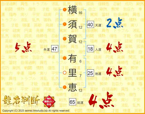 横須賀有里恵さんの総運は65画の4点!