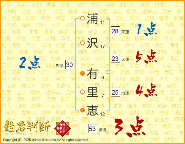 浦(11画)沢(17画) 有(6画)里(7画)恵(12画)