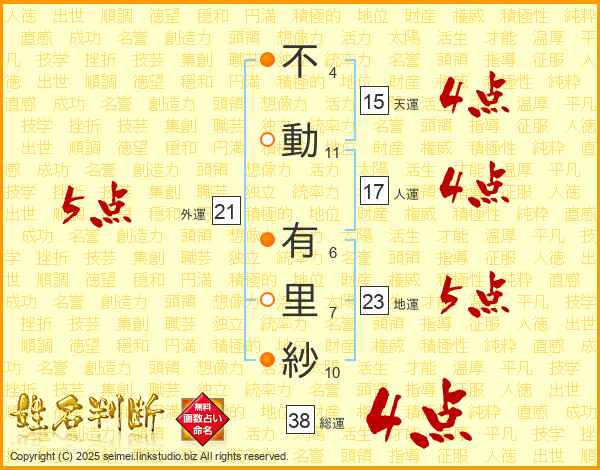 不(4画)動(11画) 有(6画)里(7画)紗(10画)