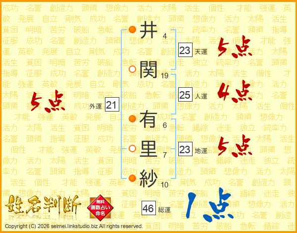 井(4画)関(19画) 有(6画)里(7画)紗(10画)