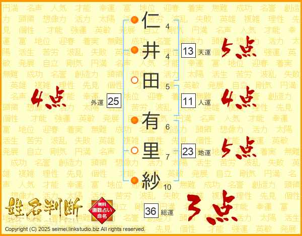 仁(4画)井(4画)田(5画) 有(6画)里(7画)紗(10画)