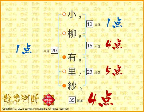 小(3画)柳(9画) 有(6画)里(7画)紗(10画)