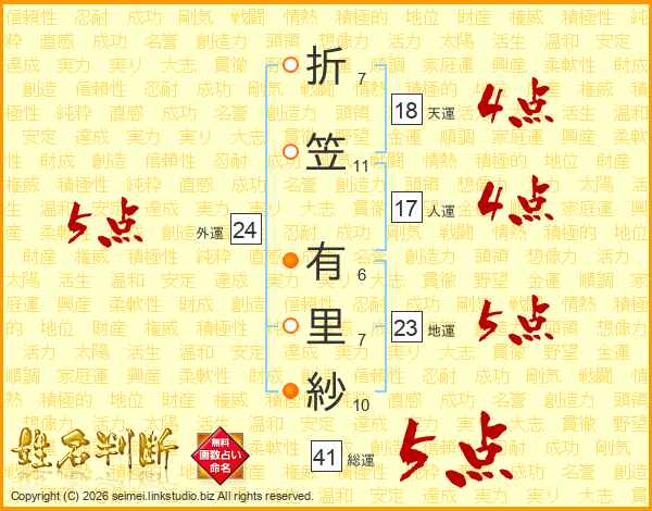 折笠有里紗さんの総運は41画の5点!