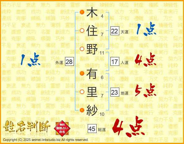 木(4画)住(7画)野(11画) 有(6画)里(7画)紗(10画)