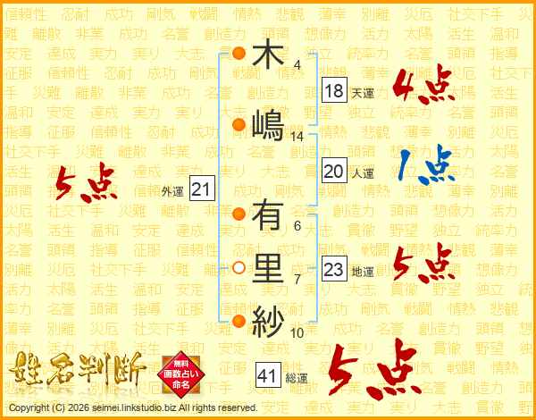 木(4画)嶋(14画) 有(6画)里(7画)紗(10画)