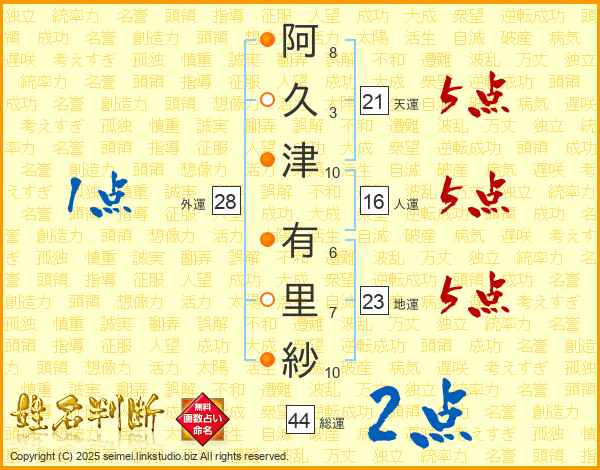 阿(8画)久(3画)津(10画) 有(6画)里(7画)紗(10画)