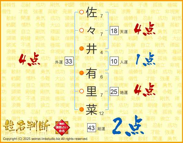 佐(7画)々(7画)井(4画) 有(6画)里(7画)菜(12画)