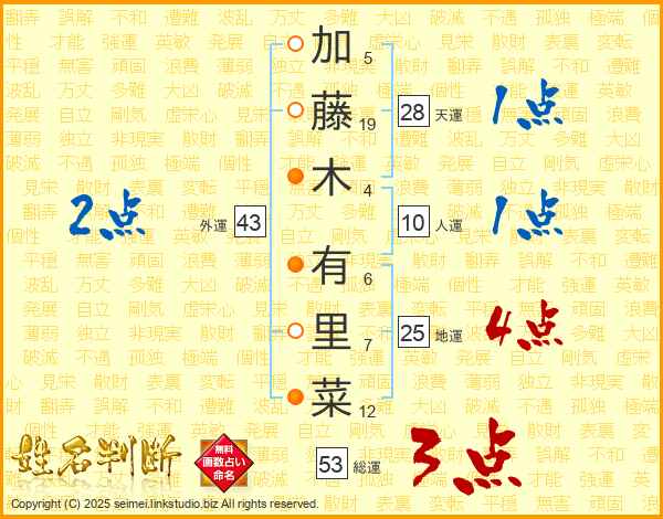 加(5画)藤(19画)木(4画) 有(6画)里(7画)菜(12画)