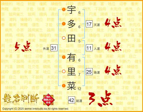 宇(6画)多(6画)田(5画) 有(6画)里(7画)菜(12画)