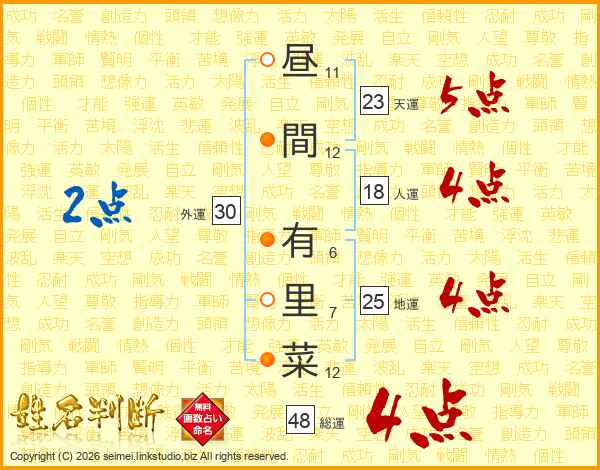 昼(11画)間(12画) 有(6画)里(7画)菜(12画)