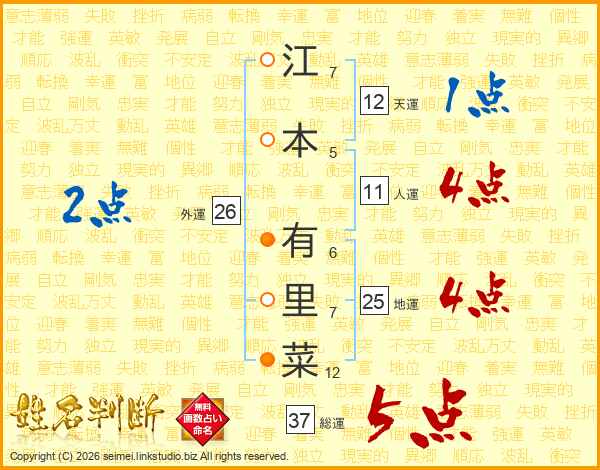 生活面を象徴する運勢です。外部から受ける影響力を表し、結婚運、家庭運や職場、環境への順応性を表します。総運から人運を引いた画数。姓や名が1文字の場合を除く。