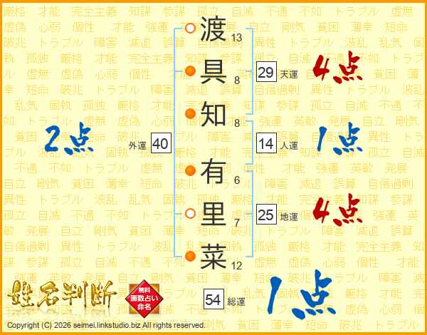 渡(13画)具(8画)知(8画) 有(6画)里(7画)菜(12画)