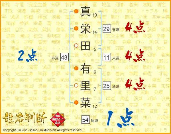 真(10画)栄(14画)田(5画) 有(6画)里(7画)菜(12画)