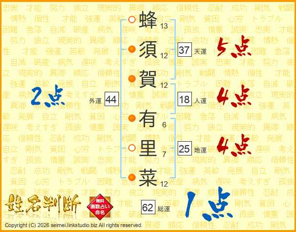 蜂須賀有里菜さんの天運は37画の5点!