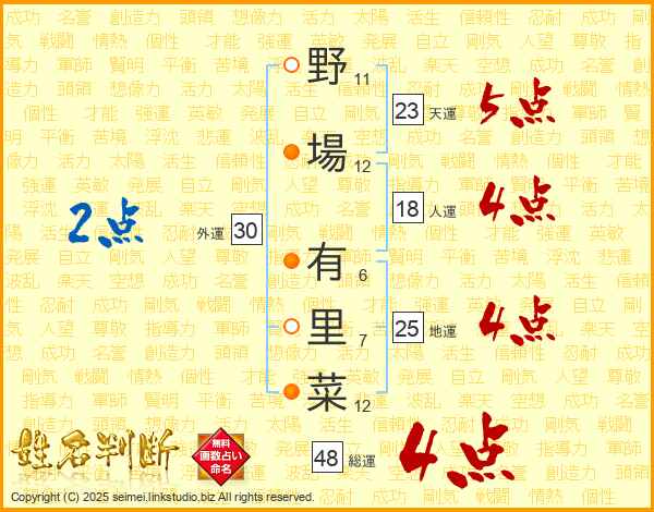 野(11画)場(12画) 有(6画)里(7画)菜(12画)