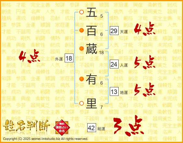 五(5画)百(6画)蔵(18画) 有(6画)里(7画)