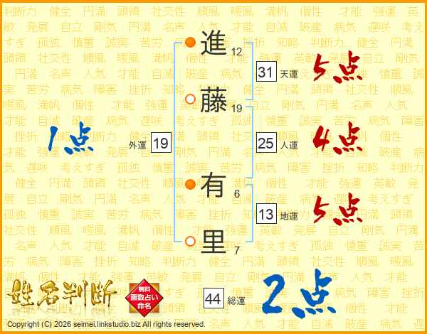 進(12画)藤(19画) 有(6画)里(7画)